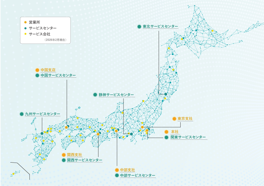 | 東北サービスセンター | 〒984-0011 宮城県仙台市若林区六丁の目西町3番24号 TEL 022-287-3977 (代) FAX 022-287-3975 |